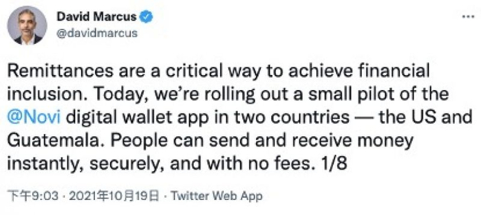 比特币期货ETF落地之后,美国金融监管机构将矛头对准了稳定币。10月20日,Facebook加密货币Diem的联合创始人宣布,正式在美国和危地马拉这两个国家之间开启了Novi数字钱包应用的小型试点。用户可以即时、安全且免费地在两国之间发送和接收资金。