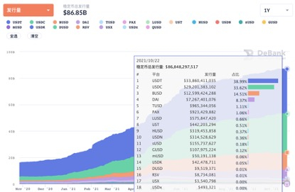 随着加密市场的发展,稳定币已经成为其中的重要一环。DeBank数据显示,2021年初至今,锚定美元的稳定币总市值突破了1200亿美元,目前链上稳定币总发行量达868.50亿美元。其中,USDT总发行量为338.60亿美元,占比38.99%;USDC总发行量为292.01亿美元,占比33.62%;BUSD总发行量为125.99亿美元,占比14.51%。