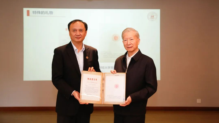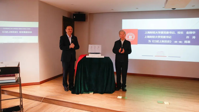 校党委书记许涛和金炳华校友共同为《口述上财校史》第一辑新书揭幕。许涛书记向与会嘉宾和代表们赠送了新书。