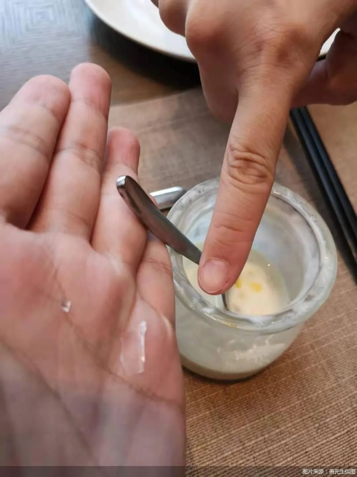 而在经理回来之后,经理便跟萧先生解释,自己不小心把碎片掉进酸奶罐里与酸奶混合在一起了。听后,萧先生便把酸奶倒在盘子里,与家人以及餐饮部经理一起寻找“无故消失"的玻璃碎片,但仍没找到。随后,经理便提议说:“一时找不到,先送医吧。”