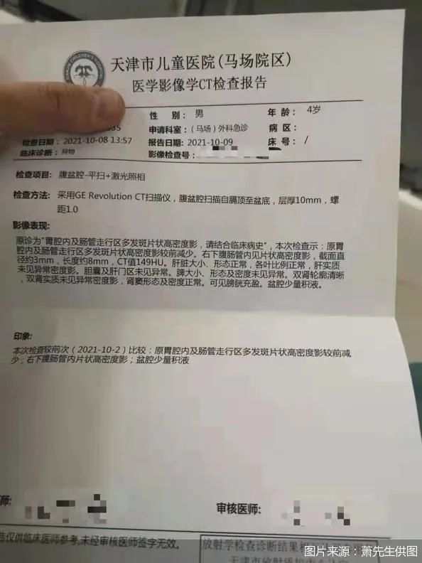 10月8日中午,萧先生的孩子出现便血症状,立刻把孩子送往医院,医生结合情况对孩子收住院进行治疗。后续检查显示,该高密度异物呈不规则状,长度至少在8mm以上。