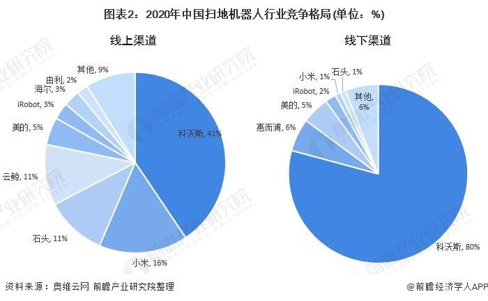 2020年,科沃斯在扫地机器人线上渠道销售中处于行业领先位置,科沃斯、小米、石头科技、云鲸市占率分别为41%、16%、11%、11%。在线下渠道方面,科沃斯扫地机器人的市场份额达到80%,处于行业领先地位,惠而浦、美的、iRobot、小米、石头的线下渠道市场份额分别为6%、5%、2%、1%和1%。