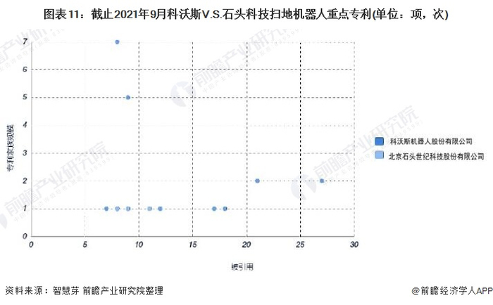 在重点专利布局上,科沃斯重点布局的专利为“扫地机器人”,该项专利被引用次数27次,专利家族规模为2项。石头科技重点布局的专利为“自主清洁设备”,该项专利被引用次数11次,专利家族规模为1项。整体来看,科沃斯重点布局的专利无论是在专利被引用次数还是专利家族规模均较石头科技多。