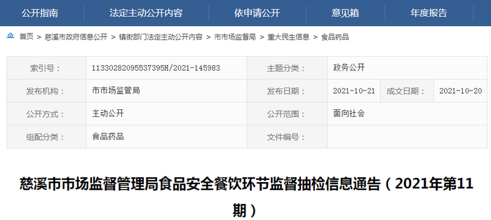 浙江省慈溪市市场监管局食品安全餐饮环节监督抽检信息通告(2021年第11期)