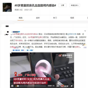 这次新闻中的孩子,就是医生在检查中发现孩子的鼻子里有一个脓包,在挖鼻孔时,源源不断的输送造成颅内感染的物质。这种情况发展下去,轻则发高烧、头痛,严重时会诱发颅内化脓、休克、意识障碍,出现永久性的神经损伤,甚至死亡。