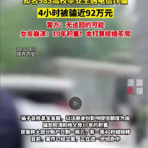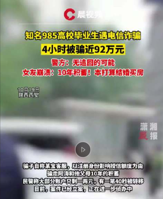 一知名985高校毕业生遭遇电信诈骗,4个小时竟然被骗近92万元。女友崩溃:本打算结婚买房。