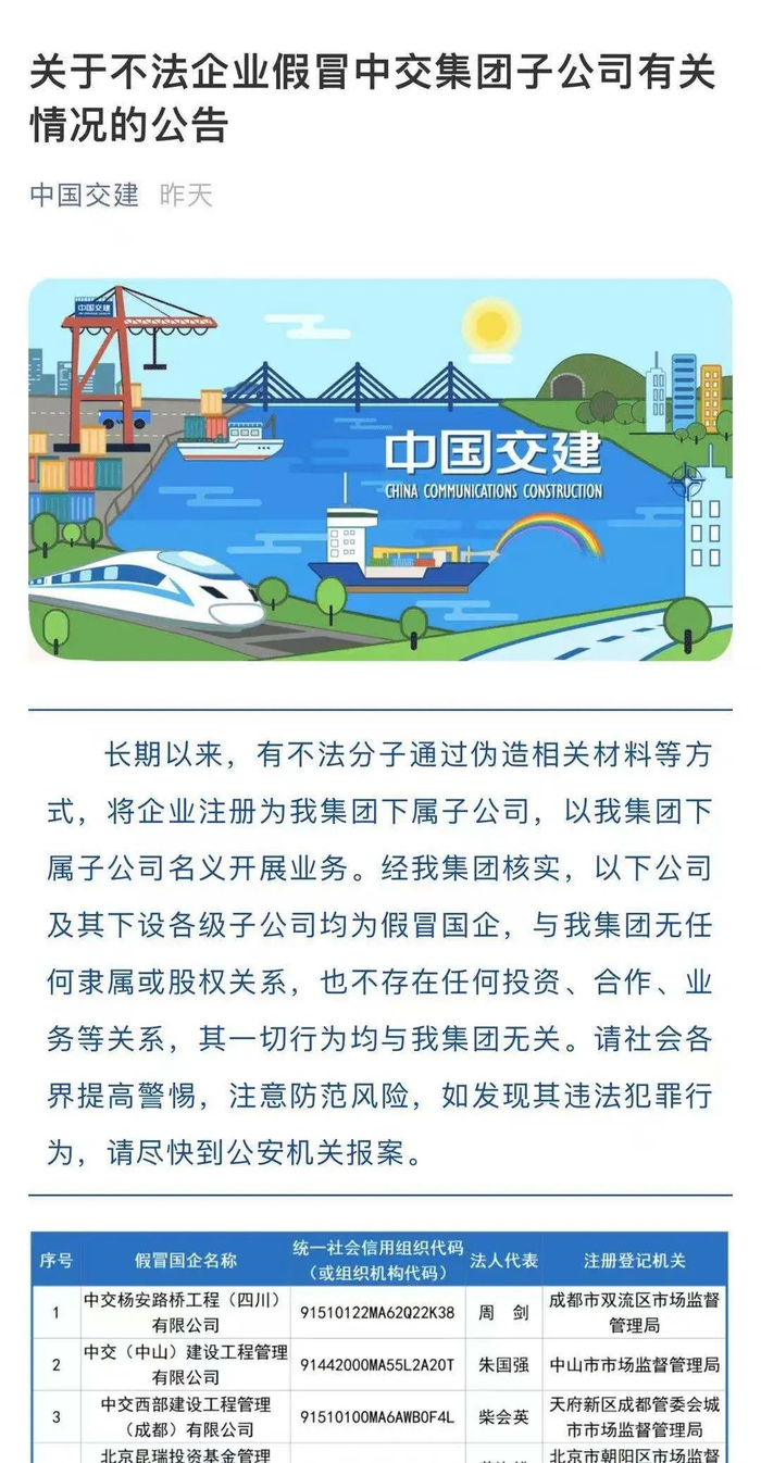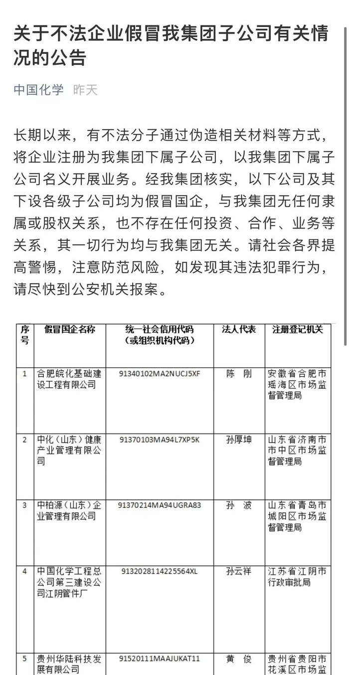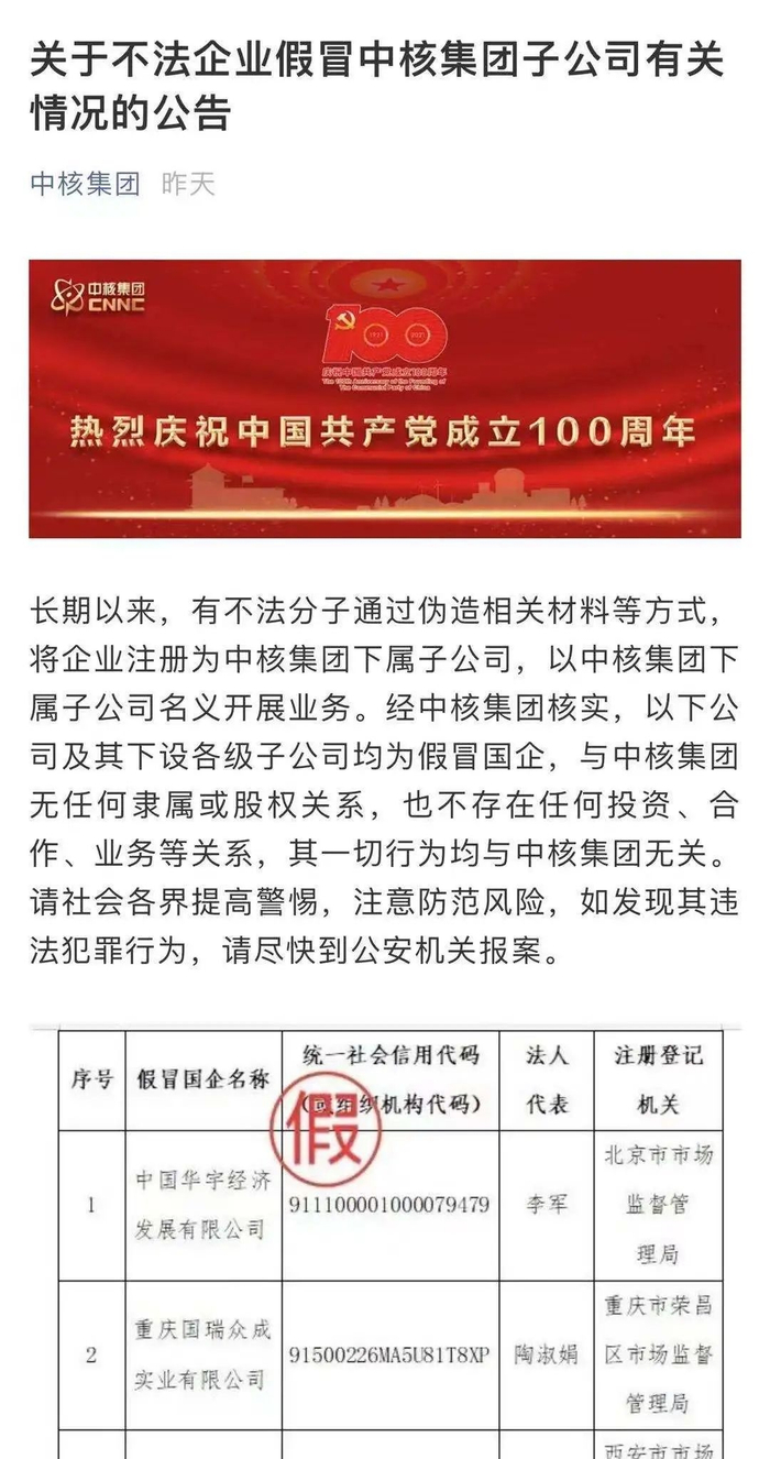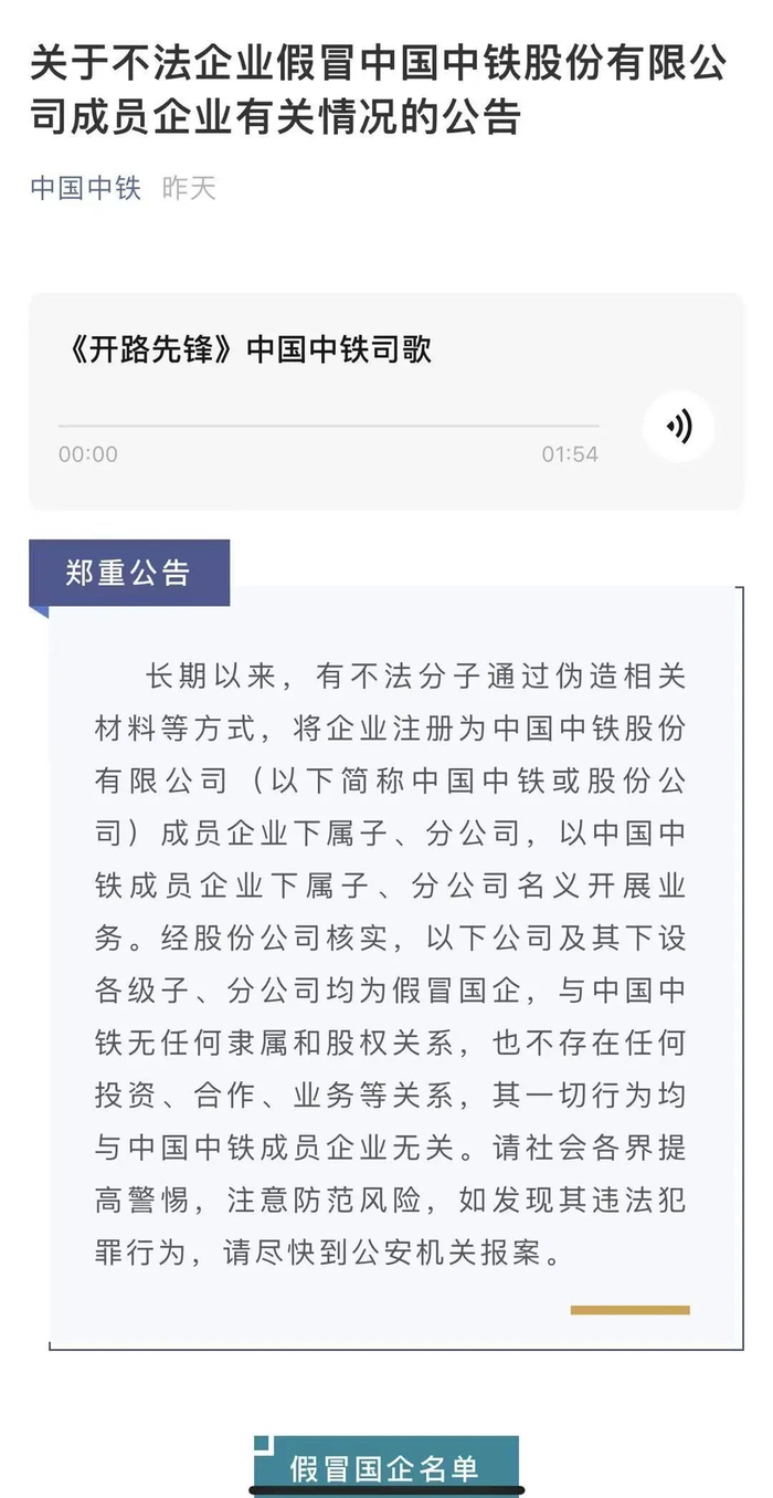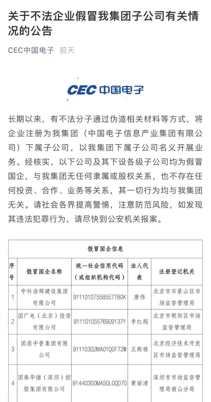 近期,部分中央企业对外公告了一批假冒国企名单,明确有关公司及其下设各级子公司均为假冒国企,与中央企业无任何隶属或股权关系,也不存在任何投资、合作、业务等关系,其一切行为均与中央企业无关。