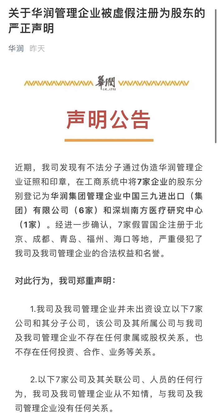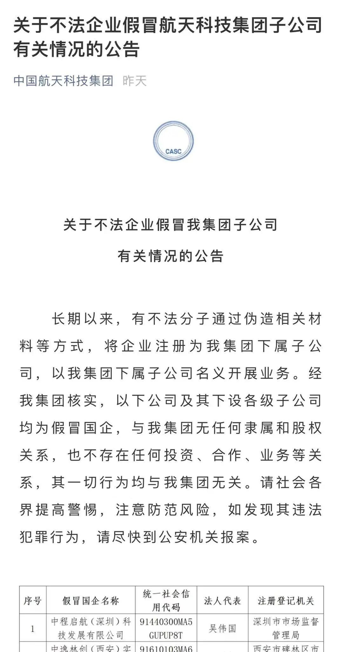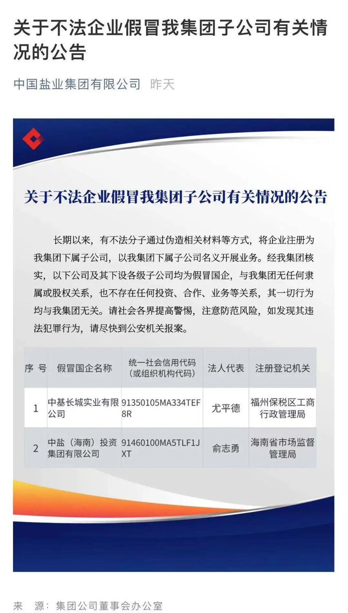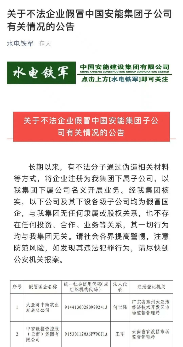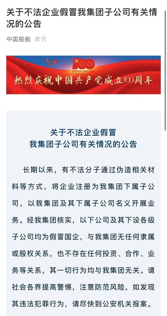 近期,部分中央企业对外公告了一批假冒国企名单,明确有关公司及其下设各级子公司均为假冒国企,与中央企业无任何隶属或股权关系,也不存在任何投资、合作、业务等关系,其一切行为均与中央企业无关。