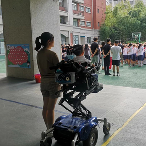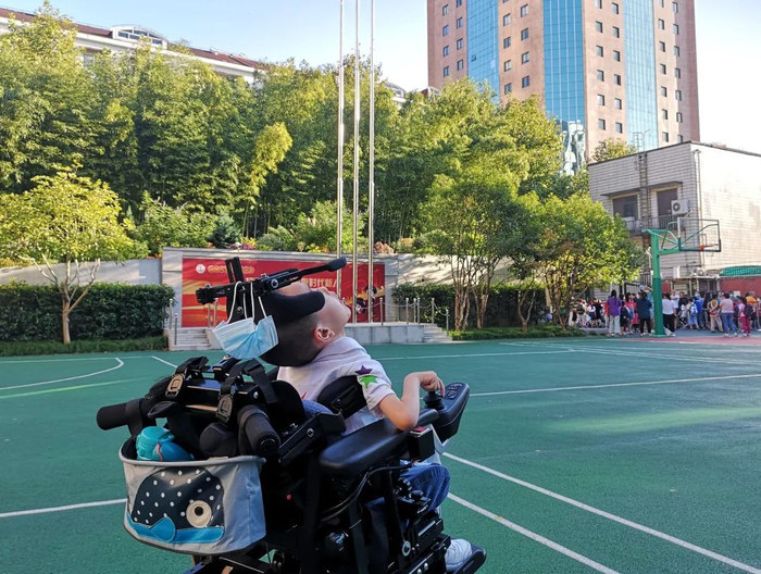 不过,他有了爸爸专门定制的轮椅,小学后正式上路,动动手指,就能加速、转向、躺倒、升高。