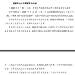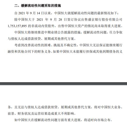 公告称自2021年9月14日以来,中国恒大就缓解流动性问题的最新情况如下:除中国恒大于2021年9月28日签订协议出售盛京银行股份有限公司1,753,157,895的非流动内资股外,出售中国恒大资产的情况尚未取得重大进展。