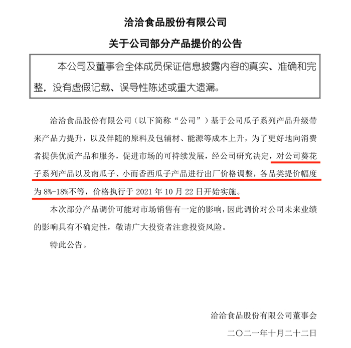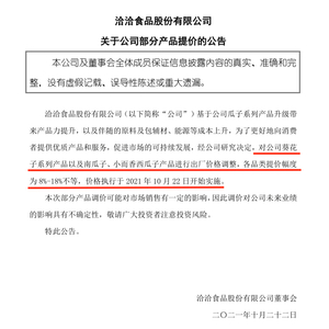据洽洽食品公告称,价格执行于2021年10月22日开始实施。