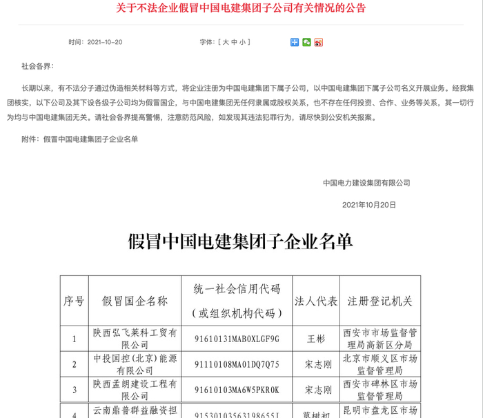 中国电建“受灾”严重,此次公告假冒集团子企业151家,注册地遍布全国各地。中国电建10月20日公告,长期以来,有不法分子通过伪造相关材料等方式,将企业注册为中国电建集团下属子公司,以中国电建集团下属子公司名义开展业务。经核实,相关公司及其下设各级子公司均为假冒国企,与中国电建集团无任何隶属或股权关系,也不存在任何投资、合作、业务等关系,其一切行为均与中国电建集团无关。中国电建提醒,请社会各界提高警惕,注意防范风险,如发现其违法犯罪行为,请尽快到公安机关报案。