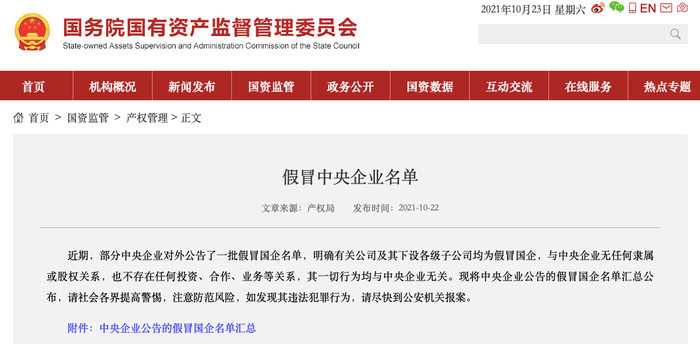 显然,这是央企的统一行动,预计接下来也将会有进一步清理假冒国企的动作。国资委产权局也发布了《假冒中央企业名单》,曝光353家假冒“中央企业”的真面目,提醒社会各界提高警惕,注意防范风险,如发现其违法犯罪行为,请尽快到公安机关报案。