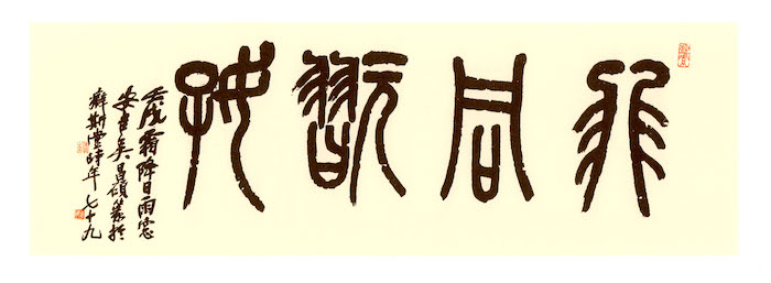 吴昌硕是一个天才,也是一个全才。他的成功更是来自于勤奋,一生书画印作品数量丰沛。“壬戌霜降”书写了“非同玩好”篆书横幅,亦是地道的石鼓文笔法。吴昌硕数十年如一日醉心于《石鼓文》而矢志不移。他以行草书笔法融汇篆隶,把平正整饬的《石鼓文》写的放纵、恣肆而又极其雄强,用此来强化了篆书的书写性和线质的表现性,借助大篆古法,注入“现代意识”,最终形成了吴氏特有的用笔基调——雄俊爽快,苍茫朴厚,古气生发,厚重中透着灵气,给人以大气磅礴、排山倒海的艺术感受。