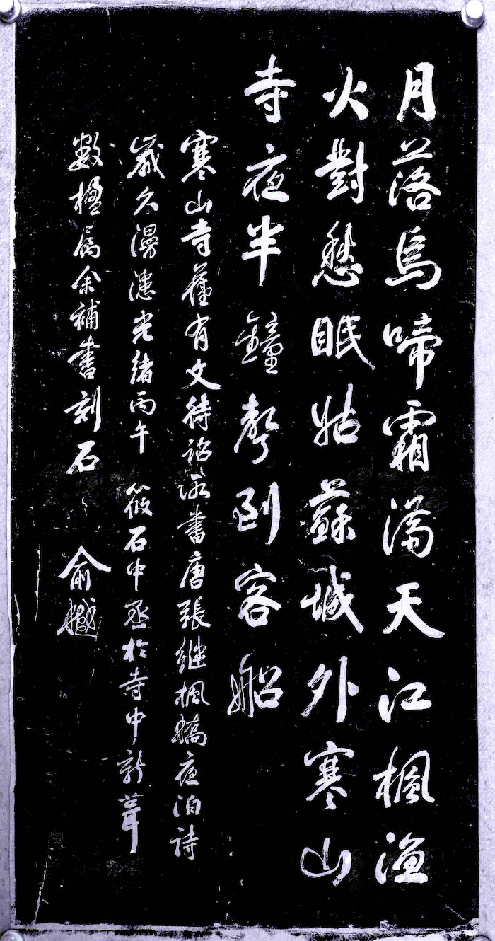 寒山寺现存有清代大儒俞樾书写的张继《枫桥夜泊》诗碑,如今成了一个著名景点。落款写道: