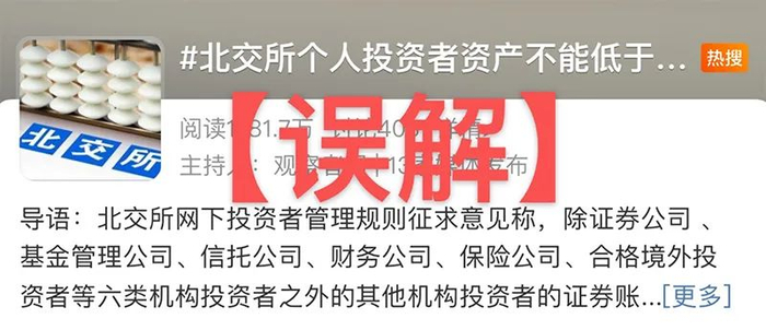 “北交所个人投资者资产不能低于1000万”今日登上部分平台热搜。经分析相关观点源头并采访业内人士,记者发现,该表述片面地将相关部门拟定的网下投资者资产标准,扩大为北交所个人投资者标准,容易引发市场误解。