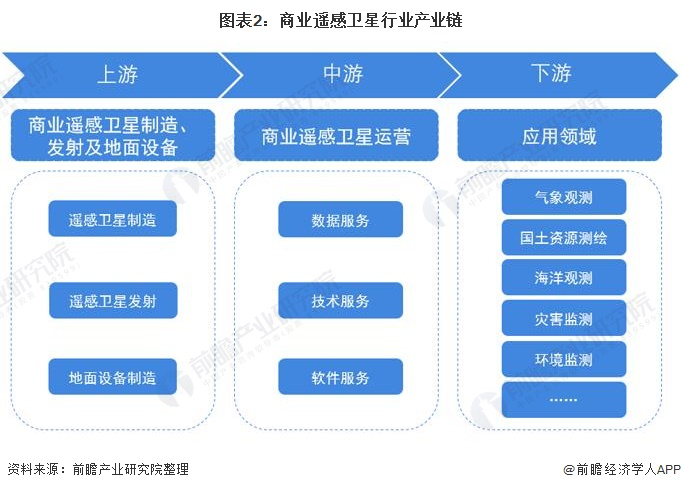 商业遥感卫星行业产业链主要分为上游商业遥感卫星制造、发射及地面设备制造商;中游为商业遥感卫星运营商,主要提供卫星遥感数据服务、相关技术服务以及开发出售基于卫星遥感数据的软件;下游为应用领域,主要应用于气象观测领域、国土测绘领域、海洋观测领域、灾害监测领域、环境监测领域等,应用范围较广。