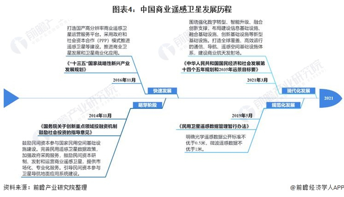 快速发展阶段以《“十三五”国家战略性新兴产业发展规划》发布为标志,提出打造国产高分辨率商业遥感卫星运营服务平台。采用政府和社会资本合作(PPP)模式推进遥感卫星等建设,推进商业卫星发展和卫星商业化应用。