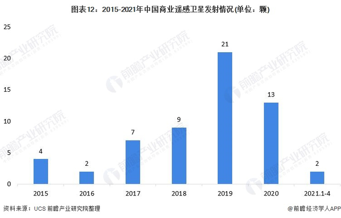 从美国忧思科学家联盟(UCS)公布的数据来看,2015-2020年中国商业遥感卫星发射情况整体向好,2019年商业遥感卫星发射数量已达到21颗。2020年受疫情影响,中国商业遥感卫星发射数量下降至13颗,相比2019年减少了8颗。2021年1-4月,中国商业遥感卫星发射数量为2颗。随着疫情对于社会经济生活的影响逐渐退去,商业遥感卫星行业持续发展,遥感卫星星座化建设节奏加快,商业遥感卫星发射数量将恢复并超过峰值水平。