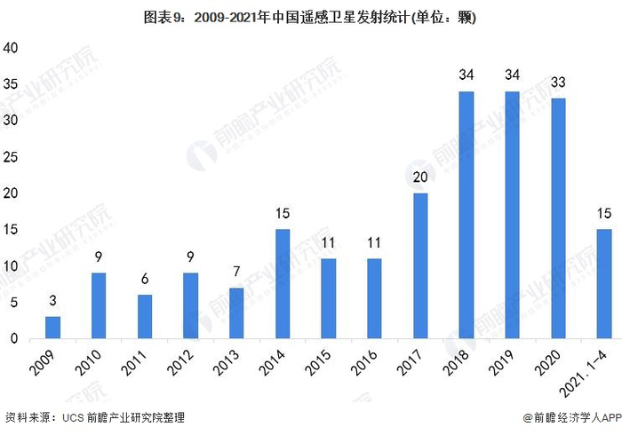 中国遥感卫星研发和制造能力近年来快速提升,卫星遥感及空间信息服务行业将步入快速发展期。2021年截至4月30日,中国发射遥感卫星数量为15颗,全年发射数量有望达到新高。
