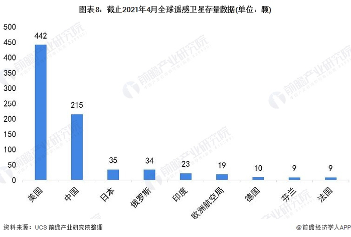 从各国(地区)拥有卫星数量角度来看,截止到2021年4月,美国拥有的遥感卫星存量排名第一,数量为442颗;其次为中国,遥感卫星存量215颗;第三为日本,数量为35颗;俄罗斯、印度、欧洲航空局遥感卫星存量在15颗以上。美国和中国遥感卫星存量相比其他国家处于绝对优势地位,但美国遥感卫星存量在中国的两倍以上,中美遥感卫星存量差距依旧明显。