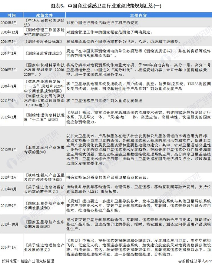随着遥感技术水平的不断提高,卫星的空间和时间分辨率、重访率及精度稳步提升,遥感卫星功能日趋强大。在满足原有遥感卫星应用需求的基础上,卫星遥感及空间信息服务能力的提升促使地理信息资源开发利用的社会认知度不断提高,社会需求更加旺盛。用户群体从以政府为主转向政府、企业和大众并重,规模不断扩大,为商业遥感卫星行业奠定了广阔的市场空间。近年来,为紧跟商业遥感卫星行业世界先进水平,拓宽市场化应用渠道,国家相继出台了一系列法律法规、规划纲要及产业鼓励政策,具体如下: