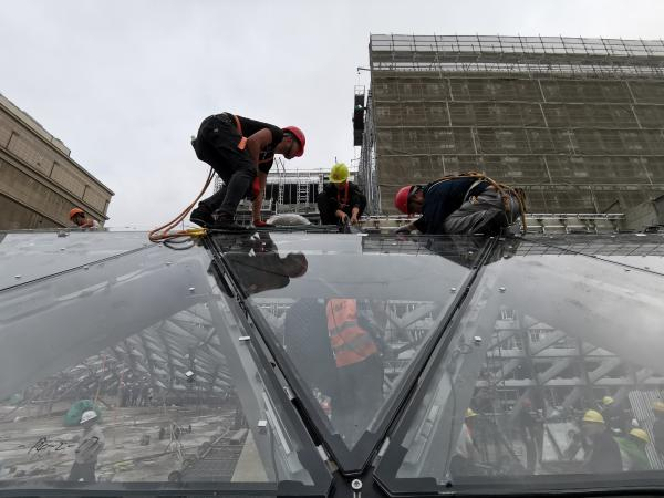 2021年5月外滩中央广场十字内街顶棚上,三名工人正在安装三角玻璃。