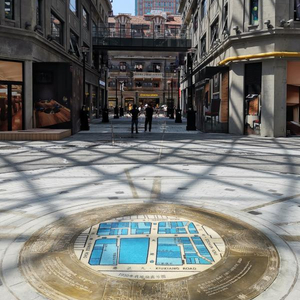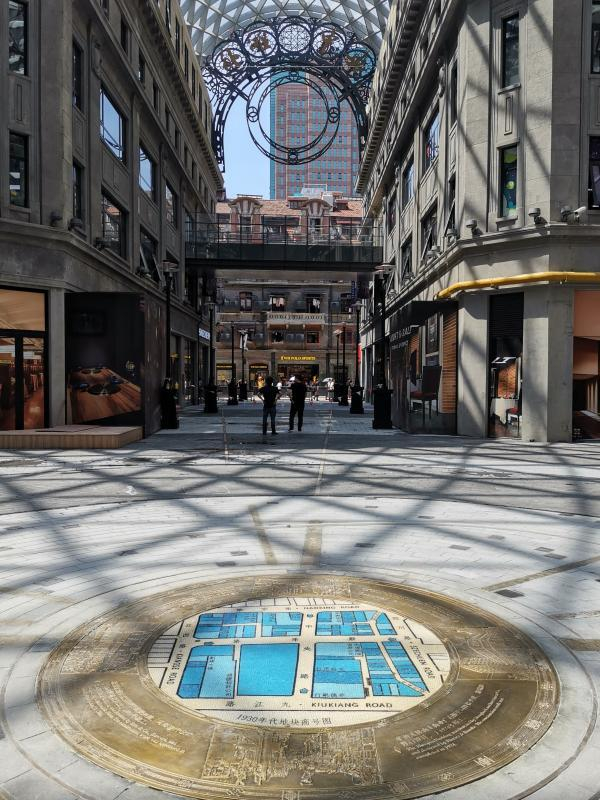 由“南京东路—四川中路—九江路—江西中路”围合起来的黄浦区179号街坊,新的片区名叫“外滩中央广场”。广场中心地面,有一个类似黑胶唱片的圆形图案。外圈为青铜,上面浮雕着四周中央大楼、美伦大楼、新康大楼、华侨大楼的轮廓,以及四幢建筑的投资商、设计所和建成时间。内圈是小方块马赛克拼成的十字街地图,白底蓝字,四幢建筑涂成蓝色块,标注着1930年代本街坊一些著名商户。从这个圆心向外,发散出十几根长短不一的青铜线条,指向东西南北四个方向。