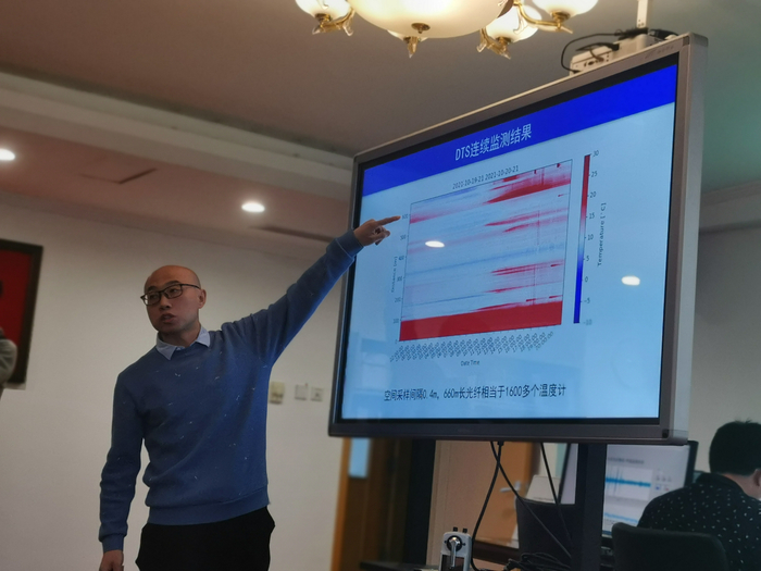 中国科学技术大学合肥微尺度物质科学国家研究中心副研究员张强在介绍DTS在地震局内对温度的监测情况。