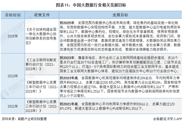 目前,针对大数据产业的“十四五”专门规划还未正式发布,但部分细分领域已对大数据的相关发展目标做出规划。《新型数据中心发展三年行动计划(2021-2023年)》提出,到2021年底,全国数据中心平均利用率力争提升到55%以上,到2023年提升至60%以上。在工业互联网发展行动计划中,提出到2023年,基本建成国家工业互联网大数据中心体系。《关于加快构建全国一体化大数据中心协同创新体系的指导意见》提出,到2025年,全国范围内数据中心形成布局合理、绿色集约的基础设施一体化格局。东西部数据中心实现结构性平衡,大型、超大型数据中心运行电能利用效率降到1.3以下。