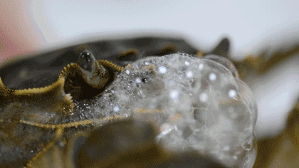 ② 把螃蟹放入水中,看蟹的嘴巴是否会吐气泡,吐气泡表示鲜活。注意不要把捆绑好的蟹长时间放入水中,因为水中氧气不足,蟹会很快窒息而死。
