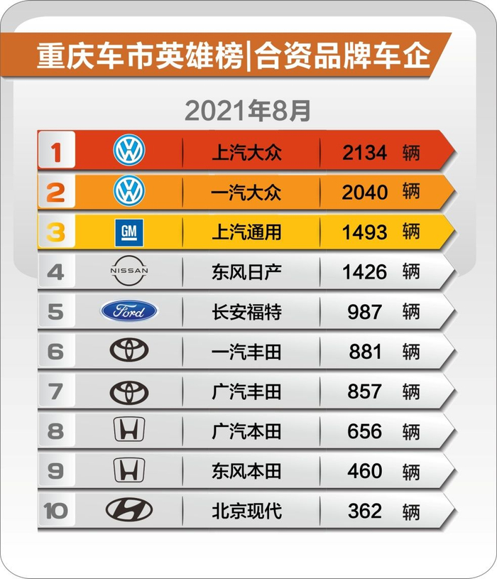 上汽大众、一汽大众、上汽通用分别以2134辆、2040辆、1493辆位居榜单前三位。东风日产、长安福特、“两田”、北京现代紧随其后。