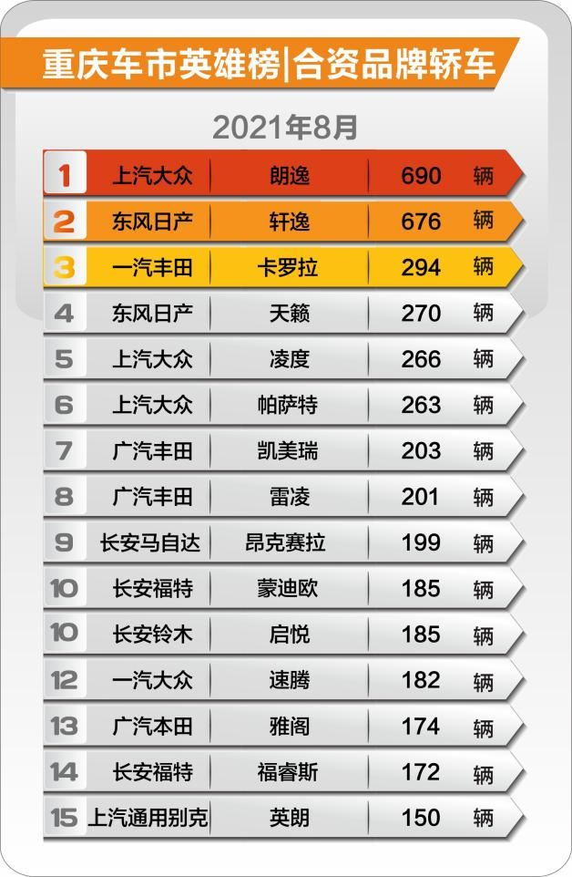 近日,重庆市汽车商业协会首次发布本地市场各细分领域的最新销量数据——《重庆地区月度车市最新消费趋势报告》。在不少人的印象中,作为山城重庆之消费者,势必会对SUV更感兴趣。报告显示,从8月的市场情况来看,各大车企合资品牌的销量“冠军”皆花落轿车车型。
