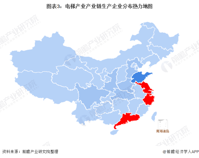 电梯产业产业链区域热力地图:广东、江苏、浙江分布最集中