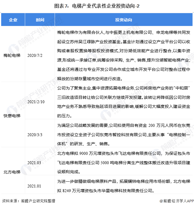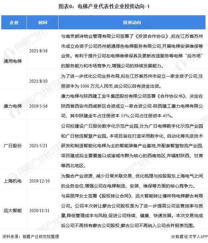 2020年以来,电梯产业代表性企业的投资动向主要包括收购公司拓展业务、通过对建立子公司的方式投资电梯生产基地项目。电梯产业代表性企业最新投资动向如下: