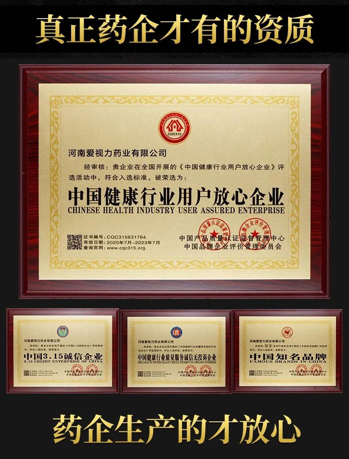 在“河南爱视力药业有限公司”官网首页也同样有“中国3·15诚信企业”荣誉证书和奖牌。