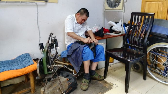 70多岁的鞋匠兄弟戚金发和戚金恒,是一对重残无业的孤老兄弟,多年来一直在永丰坊弄口摆摊修鞋。不仅兄弟二人日晒雨淋,而且弄堂口地方狭小,放上个修鞋摊,还影响了居民的进出,居民中有不少人对此有意见,居民区干部也多次劝说老人不要在弄堂口设摊。但老人也有自己的考虑:残疾又无业,总要生活下去,加上弄堂周边居民也有小修小补的需求,修鞋摊便一直未能取缔。