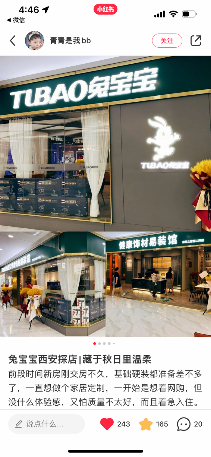 近两年兔宝宝易装馆在全国遍地开花,方便全国各地的装修客户线下逛店选购。从小红书达人们逛兔宝宝易装馆的笔记中,可以更真实地看到易装馆整体形象、选材、产品呈现效果以及门店导购的服务。因为真实所以他们的笔记下面总是有很多评论互动。