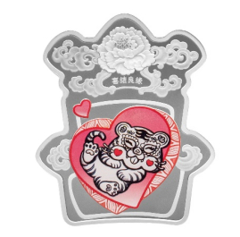 单枚金银纪念章的共同背面图案是一只小老虎,不同的是金章背面是金质小虎、银章背面的小老虎是彩色的。这只小老虎你可能在窗花剪纸中看到过,在布艺玩偶中看到过,在小孩儿的虎头枕上看到过,总之是中国传统文化中那只圆滚滚的,萌哒哒的,脸上还有着两团心形腮红的乖乖虎。小老虎的最上方是中国古式建筑的屋檐,两只落雪的大红灯笼高高挂着,灯笼中间装饰着写有“阖家欢喜”的横幅,小老虎的周围是绽放的烟花映衬着正簌簌下落的雪花,此情此景一下子就会让人想到阖家团圆的新春佳节。
