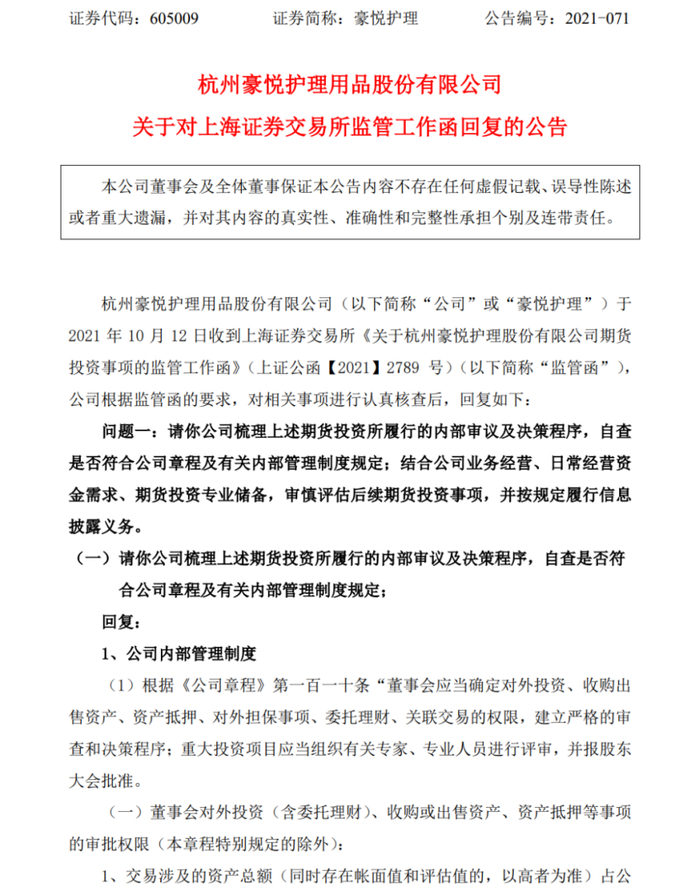 10月24日晚间,时隔两周后,豪悦护理终于回复了上交所的这份监管函,并一一回复上述问题。豪悦护理表示,公司是根据相关制度成立了金融衍生品工作小组,小组成员包括公司董事长、董事、总经理、副总经理、财务部、采购部等。同时,董事会在接到子公司期货投资报告后,及时进行了信息披露。