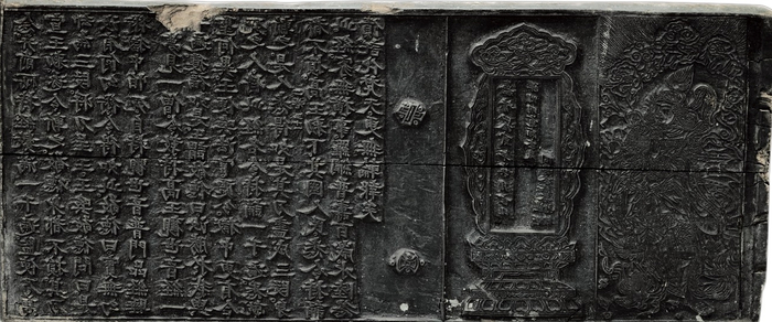 今故宫所藏佛经雕版中,以明嘉靖四十二年(公元1563年)刻《佛说高王观世音经》《大乘诸品经咒》雕版为年代最早者。此二种佛经雕版为双面雕刻,各存一块,但均为卷末版,一面经文约25行,行14字或15字。施经发愿文牌记中刻有明确纪年款,末尾镌有一尊护法将军韦陀天神像;因图版线条细密,凹刻处普遍比文字部分浅约1毫米;版刻风格苍劲有力且不失细节,特别是《佛说高王观世音经》正反面空白处分别镌刻有两种小型法宝图案。这种样式曾在明代《永乐南藏》中普遍出现,而且在南宋《碛砂藏》、元代《普宁藏》、明代《洪武南藏》中也偶有发现,不仅使刷印的佛经美观精致,还可以在刷印过程中,防止因纸张印凹陷渗墨而造成的污损,起到“支钉”的作用。从发愿文内容和行字数目、无千字文号等信息来看,两种雕版属于民间单刻佛经。这种以经文、牌记、韦陀像为顺序的佛经排版形式,最早始于《永乐南藏》。今清代以前的木刻雕版已难寻踪迹,院藏的这两块雕版是目前存世极为罕见的、有明确纪年款的明代雕版实物,且均存有版画部分,更显珍贵。