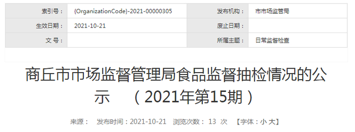 中国质量新闻网讯 2021年10月21日,河南省商丘市市场监督管理局网站刊登食品监督抽检情况的公示(2021年第15期)。本次共抽检食品30批次,经检验,合格数30批次。