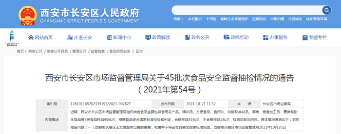 中国质量新闻网讯 近日,西安市长安区市场监督管理局发布关于45批次食品安全监督抽检情况的通告(2021年第54号)。通告称,近期,该局组织抽检食品主要包括食用农产品、调味品、方便食品、食用油、油脂及其制品、酒类、粮食加工品、薯类和膨化食品等7类食品样品45批次,根据食品安全国家标准检验和判定,合格样品43批次、不合格样品2批次。具体情况如下: