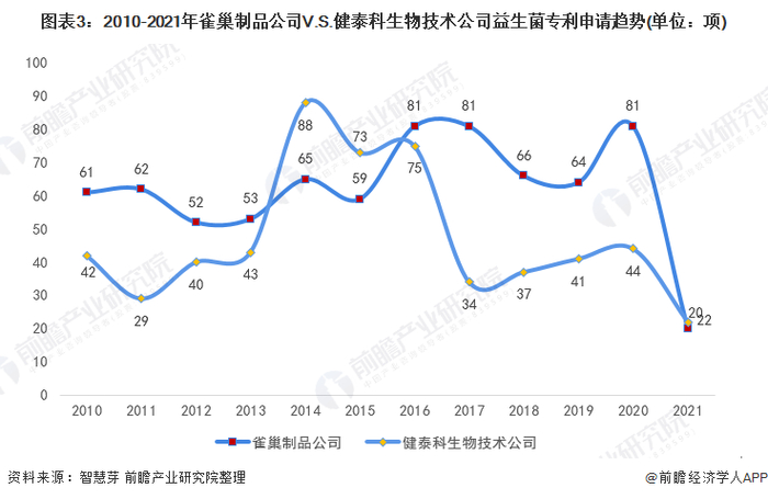 2020年,健泰科生物技术公司益生菌专利申请量为41项,雀巢制品公司益生菌专利申请量为81项。2021年1-10月,健泰科生物技术公司益生菌专利申请量为22项,雀巢制品公司益生菌专利申请量为20项。