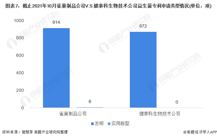 健泰科生物技术公司和雀巢制品公司益生菌专利申请类型以发明专利为主。健泰科生物技术公司全部益生菌专利为发明专利;雀巢制品公司仅有6项益生菌专利为实用新型专利,其它均为发明专利。