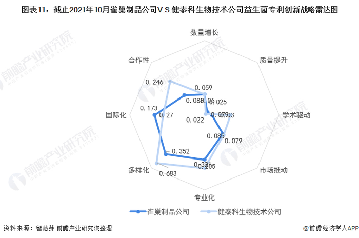 整体来看,雀巢制品公司益生菌技术在数量增长、质量提升和国际化具有相对竞争优势,健泰科生物技术公司益生菌技术则在学术驱动、市场推动、专业化、合作性、多样化上具有相对竞争优势。