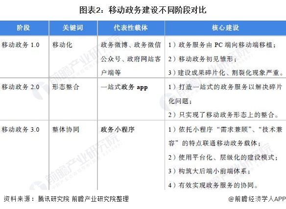根据中山大学中国公共管理研究中心联合中山大学国家治理研究院数字治理研究中心、中山大学政治与公共事务管理学院、腾讯云、腾讯研究院共同发布的《移动政务报告2021——小程序时代与移动政务3.0》。移动政务建设正在由2.0走向3.0时代,从一站式的政务服务向平台化、层级化建设模式发展,走入整体协同时代。