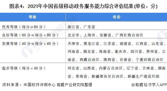 根据中国软件评测中心(工业和信息化部软件与集成电路促进中心)发布的《2021年省级移动政务服务能力调查评估报告》,从使用便捷度、内容实用度、安全保障度角度对省级移动政务服务能力进行综合评价。其中,浙江省、广东省的省级移动政务服务能力综合评估结果优秀。
