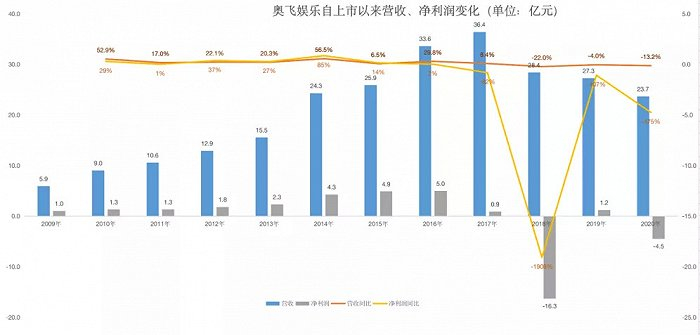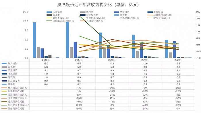 2017年,奥飞娱乐的净利润出现上市以来首次下跌,同比下滑82%。2018年,奥飞娱乐营收也出现上市以来的首次下滑,较2017年同比下滑22%。2019年和2020年,奥飞娱乐的营收仍然呈现不断下滑的态势,分别同比下滑4%、13%。