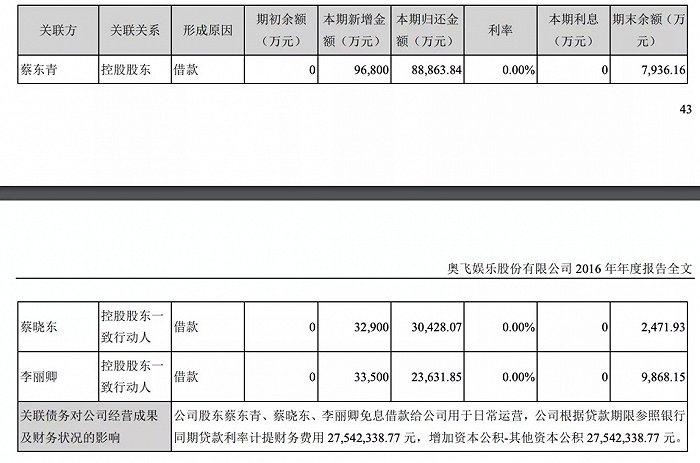 对于套现的用途,奥飞娱乐曾表示,2016年,蔡东青、李丽卿、蔡晓东将减持所得的扣除相关税费后的16.32亿元无偿借给公司。